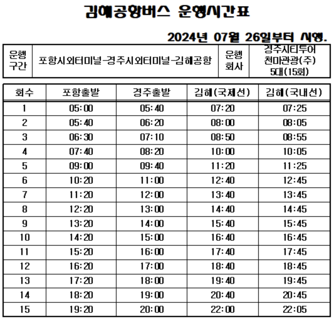 | 김해공항 국제선 출발 | 김해공항 국내선 출발 | 경주시외 경유 | 포항터미널 도착 |